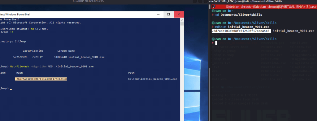 The implant is compiled and saved in the directory I am sharing via rdp so copying and executing it is trivial. I did so in the C:\Temp directory.
