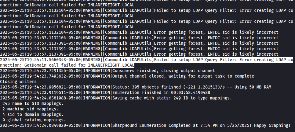 Sharphound completed very quickly, however there are some warnings as to an inability to enumerate the parent domain, inlanefreight.local.