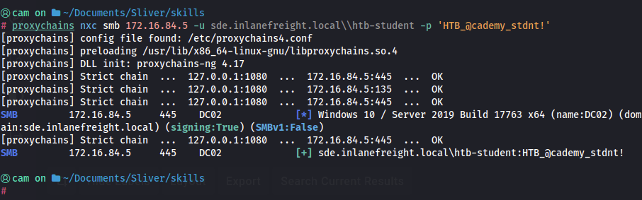 Doing a little test with proxychains and netexec, we can see that the proxy is working.