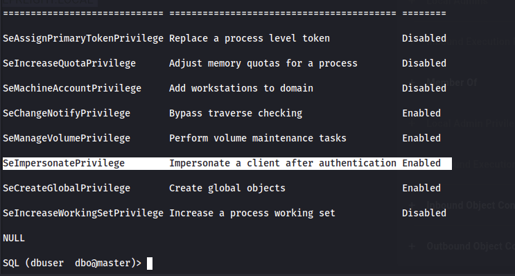 With xp_cmdshell, we can execute operating system commands including enumerating the mssql service account privileges. As shown below, the SeImpersonatePrivilege is present and has many well known token impersonation attacks available to escalate to NT Authority/System.