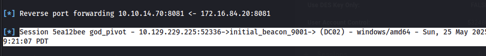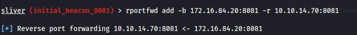 Next, to be able to download files from our attack host to DC02, we need to enable reverse port forwarding to forward traffic sent to an arbitrary port on SRV09’s internal interface to our attack box. I chose port 8081, as shown below.