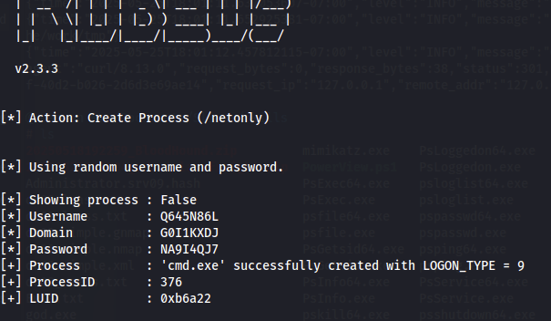 Armed with this information I created a network logon process in the pivot implant taking note of the process id and luid.